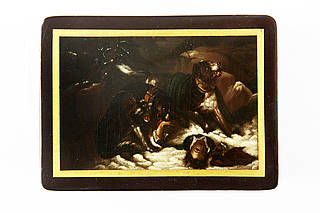 Rechteckige Dose mit losem Deckel (aus einem Vierersatz einer Spieleschatulle). In glatter Goldrahmung: Dramatische Szene im Schnee mit einem Berner Sennhund, der einen Jungen aus einer Lawine befreit.