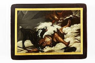 Rechteckige Dose mit losem Deckel (aus einem Vierersatz einer Spieleschatulle). In glatter Goldrahmung: Dramatische Szene im Schnee mit einem Berner Sennhund, der einen im Schnee verschütteten Jungen gegen einen angreifenden Geier verteidigt.