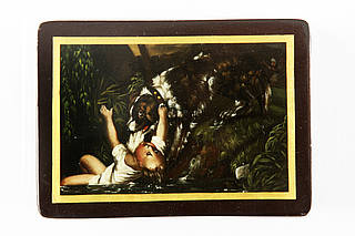 Rechteckige Dose mit losem Deckel (aus einem Vierersatz einer Spieleschatulle). In glatter Goldrahmung: Dramatische Szene am Fluß, aus welchem ein Berner Sennhund ein zu ertrinken drohendes kleines Kind herauszieht.