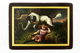 Rechteckige Dose mit losem Deckel (aus einem Vierersatz einer Spieleschatulle). In glatter Goldrahmung: Dramatische Szene mit einem Berner Sennhund, der ein auf einer Wiese eingeschlafenes kleines Mädchen vor einem Schlangenbiss bewahrt.