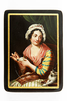 Rechteckige Spieljetondose mit losem Deckel. In glatter Goldrahmung: Junge Frau mit Rüschenhaube, Korb und Katze beim Aufwickeln eines Wollknäuels. Im Hintergrund geraffter Vorhang.