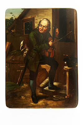 Rechteckige Jetondose mit losem Deckel (eine von vier). Älterer Mann mit einer Geige vor einer Bauernkate. Malerei nach einer Vorlage von Eduard Pistorius (1796-1862).