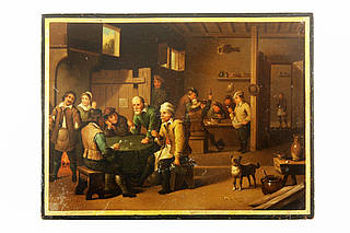Rechteckige Spieleschatulle mit vier Spieljetondosen mit Kartenspielen im Innern der Schatulle. In glatter Goldrahmung: Bauernstube mit zahlreichen bäuerlichen Personen und einem Hündchen. Im Vordergrund Spieltisch mit Glücksspielern. Malerei nach einer Vorlage von David Teniers (1610-1690).