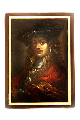 Rechteckige Spieljetondose mit losem Deckel (der Schatulle "Im Wirtshaus" zugehörig). In glatter Goldrahmung: Bildnis eines niederländischen Ratsherrn (Bürgermeister) mit Lockenfrisur, kostbarem, reich verzierten Kostüm und Pelzbarett. Malerei nach einer Vorlage von Rembrandt Harmensz van Rijn (1606-1669).