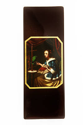 Rechteckige Spiele-Utensiliendose mit losem Deckel (der Schatulle "Im Wirtshaus" zugehörig). In glatter, achteckiger Goldrahmung: Junge, in einem Boudoir sitzende Frau in Barockkostüm mit pelzverbrämter Jacke beim Füttern eines Papageis. Im Hintergrund geraffter Vorhang.