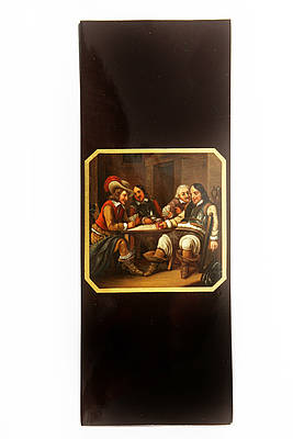 Rechteckige Spieljetondose mit losem Deckel (der Schatulle "Der Zahltag" zugehörig). In glatter, achteckiger Goldrahmung: Interieurszene mit vier Kartenspielern in Kostümen der Barockzeit an einem Tisch.
