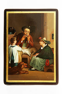 Rechteckige Spieljetondose mit losem Deckel (der Schatulle "Der Zahltag" zugehörig). In glatter Goldrahmung: Interieurszene mit einem Maultrommelspieler, der einer Frau und einem Kind vorspielt. Im Vordergrund ein liegender Hund. Malerei nach einer Vorlage von David Wilkie (1785-1841).