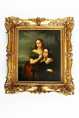 Gemälde mit Originalrahmen der Zeit. Bildnisse zweier Freundinnen der Biedermeierzeit in einer Ideallandschaft. Im Hintergrund Schloßanlage, See und Berge. Vergoldeter, reich verzierter Holzrahmen mit Papiermaché-Ornamenten.