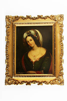 Gemälde mit vergoldetem, reich ornamentiertem Rahmen der Zeit. Bildnis einer jungen, festlich gekleideten Frau mit Federbusch am Turban, Stola, Perlenketten und weiteren Schmuckstücken. Neutraler, dunkler Hintergrund.