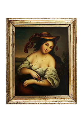 Gemälde mit später hinzugefügter sogenannter Waschgoldleiste. Junge Gärtnerin mit Strohhut, tiefem Decolleté und Blumen im Arm. Landschaftshintergrund.