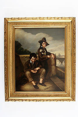 Gemälde mit später hinzugefügtem, vergoldeten Rahmen. Zwei Bettelknaben an einem Mauervorsprung am Fluß. Einer von ihnen mit bekleidetem, kleinen Äffchen im Arm und Kette in der Hand, der zweite sitzend beim Zählen seines Geldes. Im Hintergrund Brücke und Blick auf eine Stadt, Bäume und Wolkenhimmel.