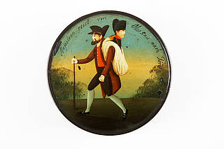 Runde Dose mit einer Persiflage auf den Rückzug Napoleons aus Moskau. Wandernder Russe mit Wanderstab trägt nach Napoleons Niederlage den französischen Kaiser im Rucksack zurück nach Paris.