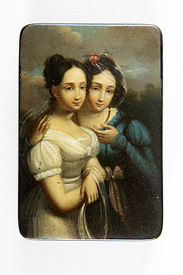 Rechteckige Dose mit zwei Freundinnen in Biedermeierkleidern, von denen die eine, die einen Schleier mit Rose im Haar trägt, ihre Freundin im Brautkleid dem Bräutigam präsentiert. "Ja, das ist sie!" Im Hintergrund Bäume und Wolkenhimmel.