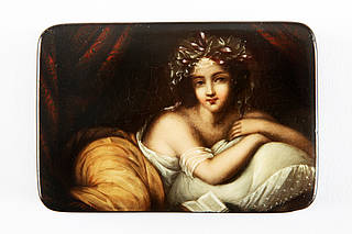 Rechteckige Dose mit junger, leicht bekleideter Schönheit mit Rüschenhaube mit Schleifen im Schlafgemach in freudiger Erwartung. Vor ihr ein aufgeschlagenes Buch. Im Hintergrund zu beiden Seiten geraffter Vorhang.