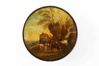 Runde Dose mit Pferdegespann mit Erntewagen, weiteren Pferden sowie Pesonenstaffage an einem Wildbach. Malerei nach einer Vorlage von Philips Wouwerman (1619-1668).