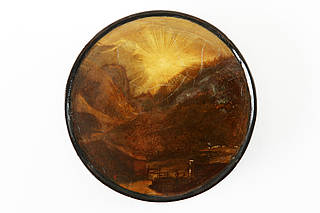 Runde Dose mit einer Landschaft mit strahlendem Sonnenaufgang. Im Vordergrund Mauer mit Holzpforte.