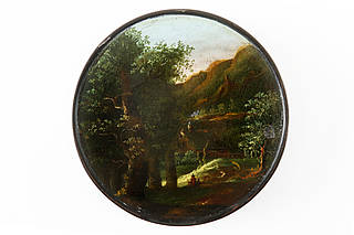 Runde Dose mit einer Landschaft mit Bauernhaus am Bach. Im Vordergrund Angler am Bach.