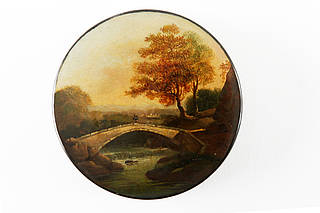 Runde Dose mit gerader Wandung. Flußlandschaft im Vorharz mit Brücke mit Wanderer. Dahinter Bäume und Blick in die Ferne. Malerei im Stil des Pascha Weitsch (1723-1803).