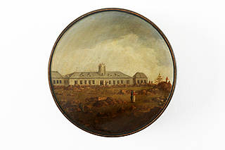 Runde Dose mit dem Brockenhaus mit Aussichtsturm auf dem Brocken. Im Vordergrund Geröll und Personenstaffage. Dunkler Wolkenhimmel.