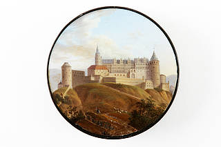 Runde Dose mit Blick auf das Heidelberger Schloß vor seiner Zerstörung. Im Vordergrund Hirt mit Schafen.