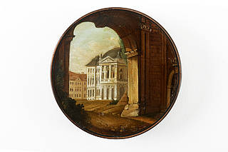 Runde Dose mit Blick durch einen monumentalen Torbogen auf ein Stadtpalais sowie ein größeres Stadthaus. Im Vordergrund Schotterweg und Buschwerk.