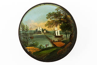 Runde Dose mit einer Landschaft in Schleswig-Holstein. Fährhafen mit Blick über die Trave bei Lübeck. Im Vordergrund Flußufer mit Rasen, Bäumen, Büschen und Personenstaffage. Auf dem Fluß Segelschiffe. Im Hintergrund auf der gegenüberliegenden Seite Fährhäuser.