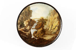 Runde Dose mit einer Ansicht der "Großen Strasse des Simplon" aus den Walliser und Tessiner Alpen. Felslandschaft mit Wasserfall, Brücke und Personenstaffage. Malerei nach einer Vorlage von Vater und Sohn Gabriel und Mathias Gabriel Lory (1763-1840 bzw. 1784-1846).
