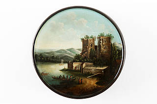 Runde Dose mit einer Rheinlandschaft. "Die Ruine bei Rüdesheim". Im Vordergrund mit Personen besetzte Boote und weitere Personenstaffage. Blick über den Rhein auf Bäume und Hügel.