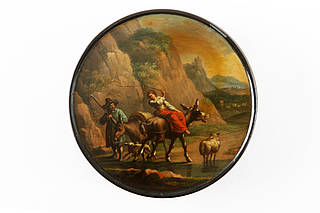 Runde Dose mit Eseltreiberin mit zwei Eseln und Schafhirte mit Schafen an einer Wasserstelle in bergiger Landschaft. Malerei nach einer Vorlage von Nicolaes Berchem (1620-1683).