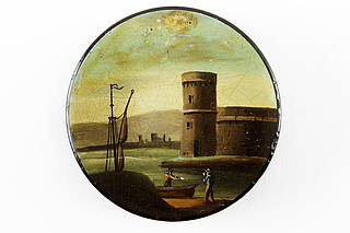 Runde Dose mit einer Hafenszene. Zwei Fischer mit Segelboot vor einer Burganlage am Meer. Im Hintergrund eine weitere Burg.