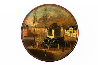 Runde Dose mit einem Stadtplatz mit Kriegerdenkmal in Frankfurt am Main. Personenstaffage.