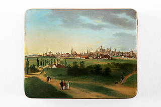 Rechteckige Dose mit einer Wiesenlandschaft mit Personenstaffage mit Blick auf die Stadtsilhouette von Nürnberg.