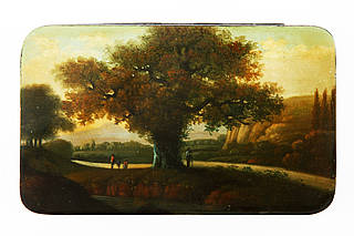 Rechteckige Dose mit Vorharzlandschaft mit dem Brocken. Im Zentrum mächtige Eiche und Personenstaffage. Im Vordergrund ein Bach. Malerei im Stil des Pascha Johann Friedrich Weitsch (1723-1803).