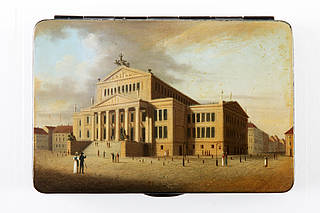 Rechteckige Dose mit einer Darstellung des Berliner Gendarmenmarktes mit dem von Karl Friedrich Schinkel (1781-1831) erbauten Neuen Schauspielhaus. Malerei nach einer Aquatinta von Friedrich Jügel nach Schinkels Stich von 1833.