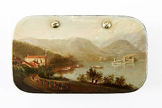 Kleine, rechteckige Dose mit stark abgerundeten Ecken. Schweizer Landschaft am Lago Maggiore mit Prozessionszug zur Kirche sowie Blick auf die Insel Isola Bella.