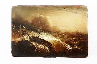 Rechteckige Dose mit gekentertem Schiff in stürmischer See und Schiffbrüchigen auf Felsplateau. Im Hintergrund weitere, in Seenot geratene Segelschiffe. Dunkle Wolkenbänke. Malerei nach einer Vorlage von Claude Joseph Vernet (1714-1789).