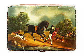 Rechteckige Dose mit einer Jagdszene. Laufender Jäger mit Falken auf dem Arm und seinem Pferd am Zügel sowie drei Hunden in einer Landschaft. Im Hintergrund zwei weitere Reiter auf Pferden.