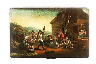 Rechteckige Dose mit einer ausgelassenen, fröhlichen Bauerngesellschaft im Freien vor einer Bauernkate. Malerei im Stil des David Teniers (1582-1649).