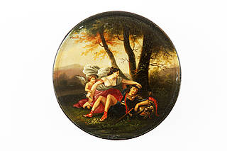 Runde Dose mit Venus und Amor in einer Landschaft unter einem Baum beim Betrauern des toten Adonis.