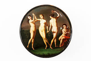 Runde Dose mit den drei unbekleideten Grazien beim Tanz im Freien, denen von Amor zum Tanz aufgespielt wird. Malerei nach einer Vorlage von Angelika Kauffmann (1741-1807).