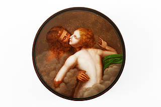 Runde Dose mit mythologischer Darstellung. Göttervater Jupiter erscheint seiner Geliebten Jo, der Tochter des Königs Argos, zur Vereinigung in Gestalt einer Wolke.