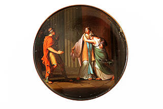 Runde Dose mit dem makedonischen König und Stadtbelagerer von Athen Demetrios (um 336 v. Chr. - 283 v. Chr.) in überraschter Pose vor zwei sich umarmenden, griechisch gewandeten Frauen im Tempel.