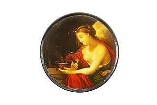 Runde Dose mit Hebe, Tochter des Zeus und der Hera beim Tränken des Adlers von Zeus aus einer goldenen Schale. Vor heroischem Wolkenhintergrund mit Blitzen.