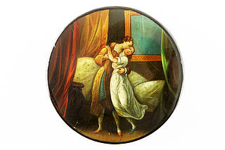 Runde Dose mit doppeltem Boden. Auf dem Deckel: sich innig umarmendes Liebespaar im Alkoven. Im doppelten Boden: Paar beim Liebesspiel.