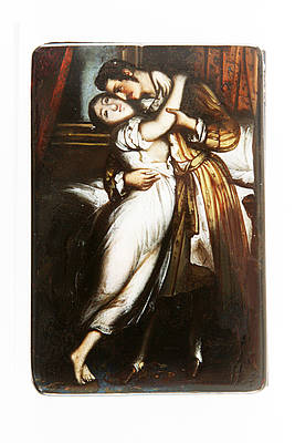 Rechteckige Dose mit jungem, sich umarmendem Paar im Schlafgemach. "Die erste Nacht nach der Hochzeit".