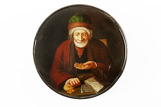 Runde Dose mit zufrieden lächelndem, Golddukaten zählendem Alten mit Hausmantel und Mütze mit Pelzrand am Tisch. Vor ihm ein aufgeschlagenes Rechnungsbuch. Malerei vermutlich nach einer Vorlage von Rembrandt Haremszoo van Rijn (1606-1669).
