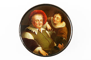 Runde Dose mit beleibtem Niederländer (vermutlich Falstaff) mit Barrett, dem von einer Frau Wein aus einem Krug in sein überdimensionales Glas gegossen wird. Malerei vermutlich nach einer Vorlage von Frans van Mieris (1635-1681).