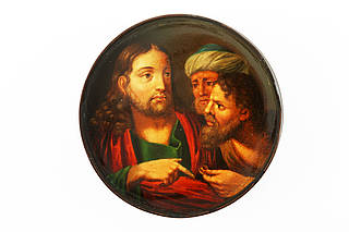 Die runde Dose zeigt Christus mit zwei Männern, von denen ihm einer eine Münze mit Porträt hinhält. Malerei nach einer Vorlage von Domenico Zampieri, genannt Domenichino (1581-1641).