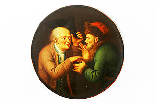 Runde Dose mit zwei älteren Männern, von denen der eine dem anderen aus seiner Schnupftabaksdose eine Prise anbietet. Neutraler Hintergrund.