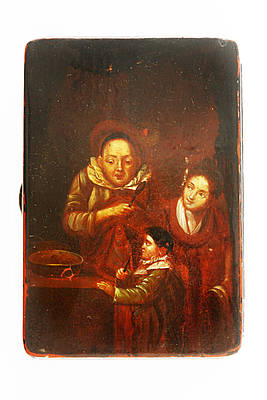 Rechteckige Dose mit einer Interieurszene in einer bäuerlichen Küche. Vater, Mutter und Kind warten ungeduldig am Kochtopf auf die Fertigstellung der Speise.